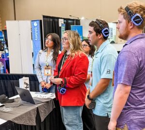 Students from FTDM 40210: Podcasting listen intently to a vendor at the 2025 Podcast Movement conference.