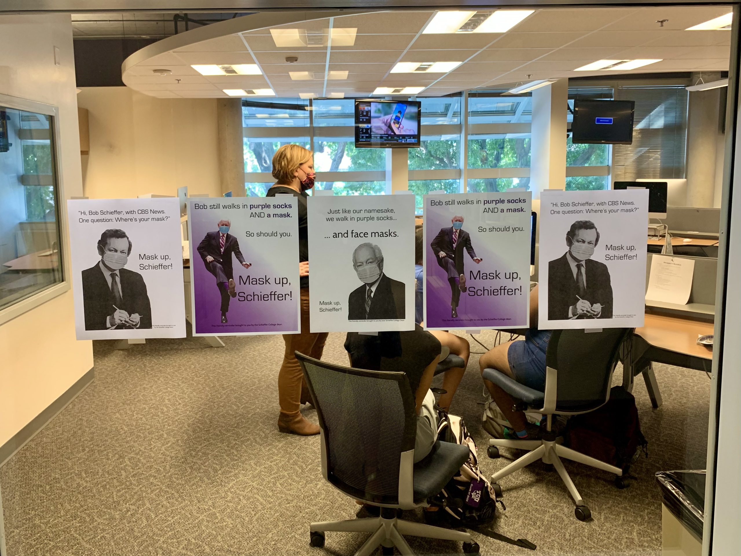 If you’ve wandered the halls of Moudy South in recent weeks, you may have noticed the catchy Bob Schieffer-themed signs reminding Schieffer students, faculty and staff to wear a face mask.