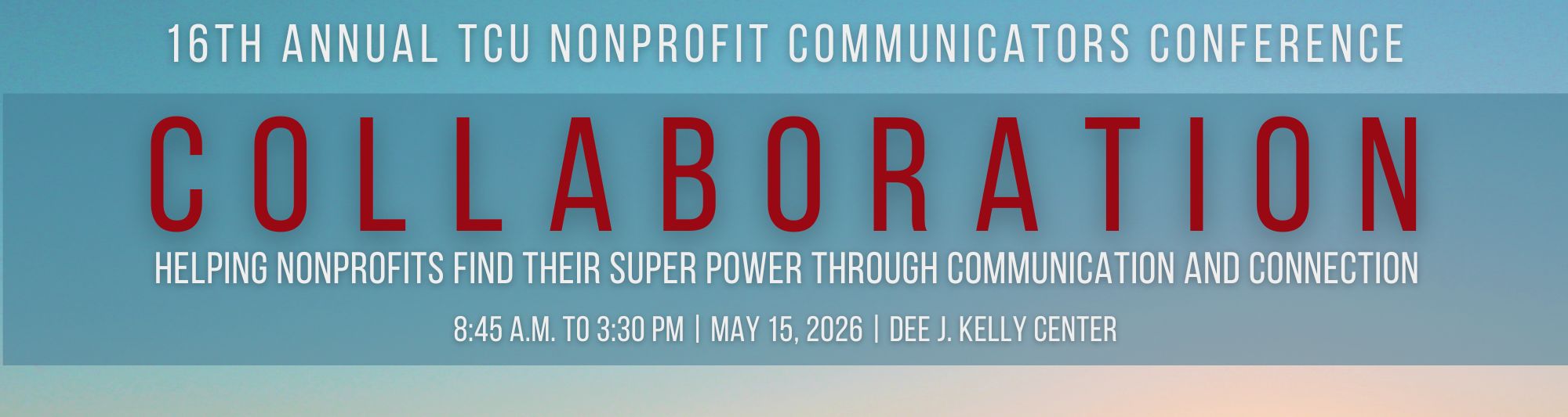 Registration is now open for the 16th Annual TCU Nonprofit Communicators Conference, which runs 8:45 a.m. – 3:30 p.m. Friday, May 15, 2026, in TCU’s Dee J. Kelly Alumni and Visitors Center, 2820 Stadium Drive, Fort Worth.